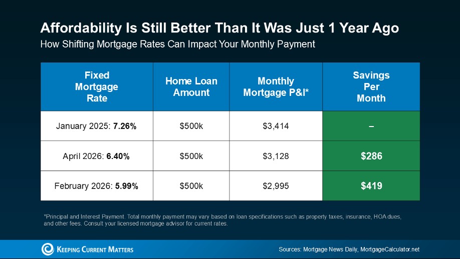 That means this recent increase in rates hasn’t erased the progress we’ve seen. Buying is still more affordable than it was a year ago. (see below):