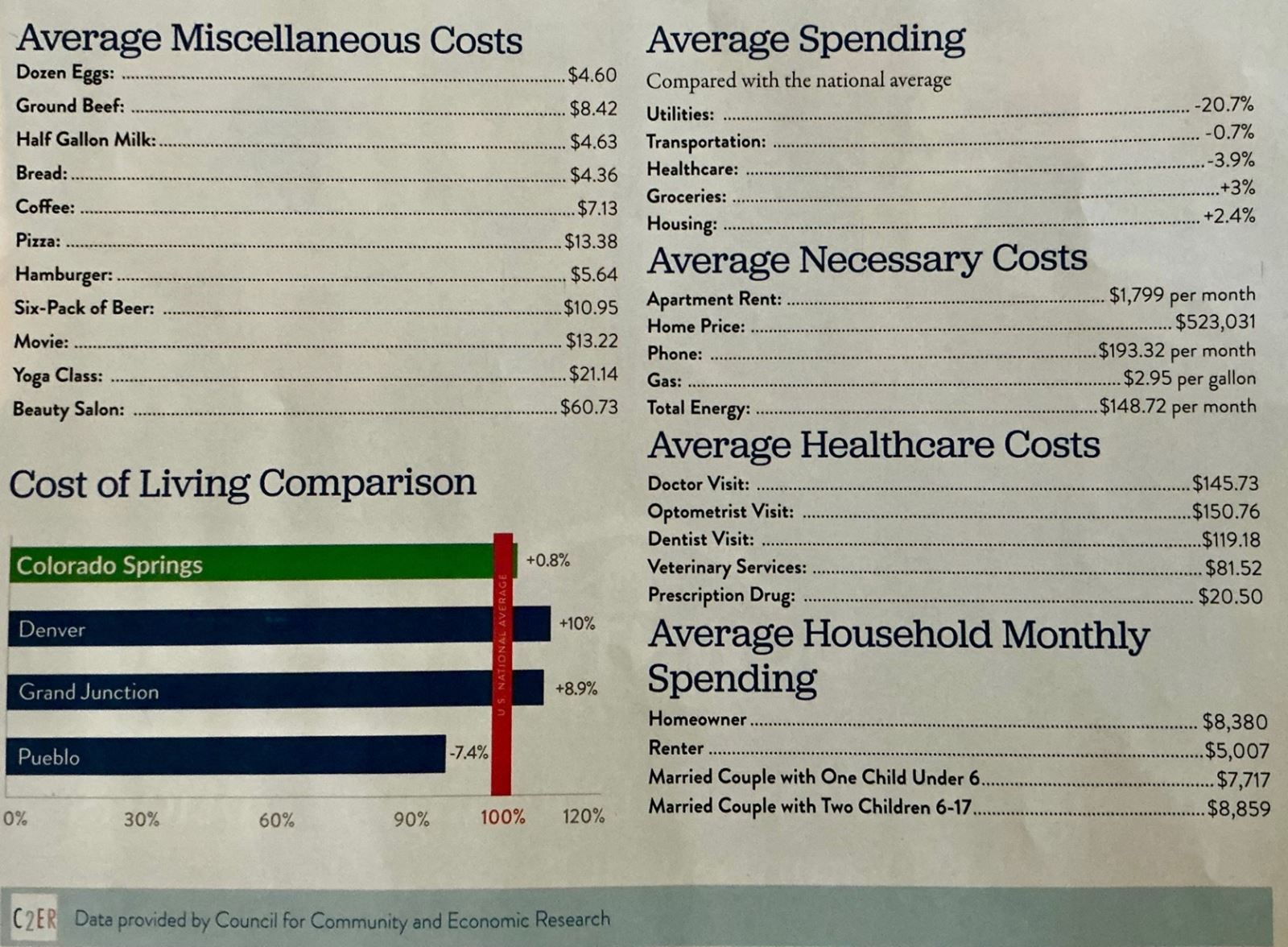 Oftentimes it is easier to try and ballpark what some of our average costs might be and recently I read an article in the Colorado Springs Chamber and EDC’s “2026 relocation Guide” that had some current cost comparisons that might interest you.